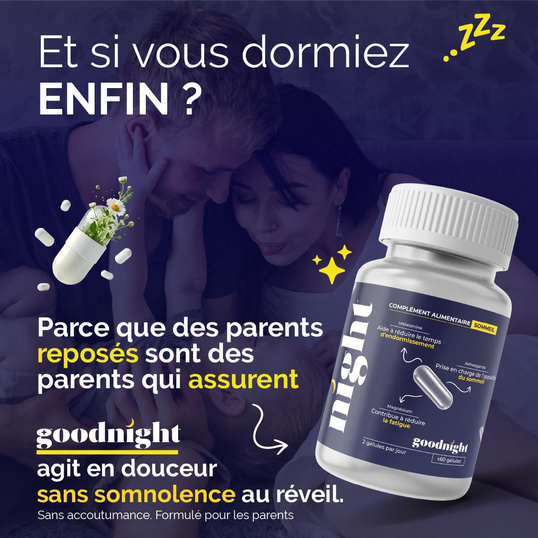Chez Goodnight, nous savons que chaque minute de sommeil compte pour les parents. Nos formules sont développées et conditionnées en France, avec transparence et bienveillance. Chaque gélule incarne notre engagement : vous aider à décrocher vite, dormir mieux et vous réveiller plus apaisé(e).